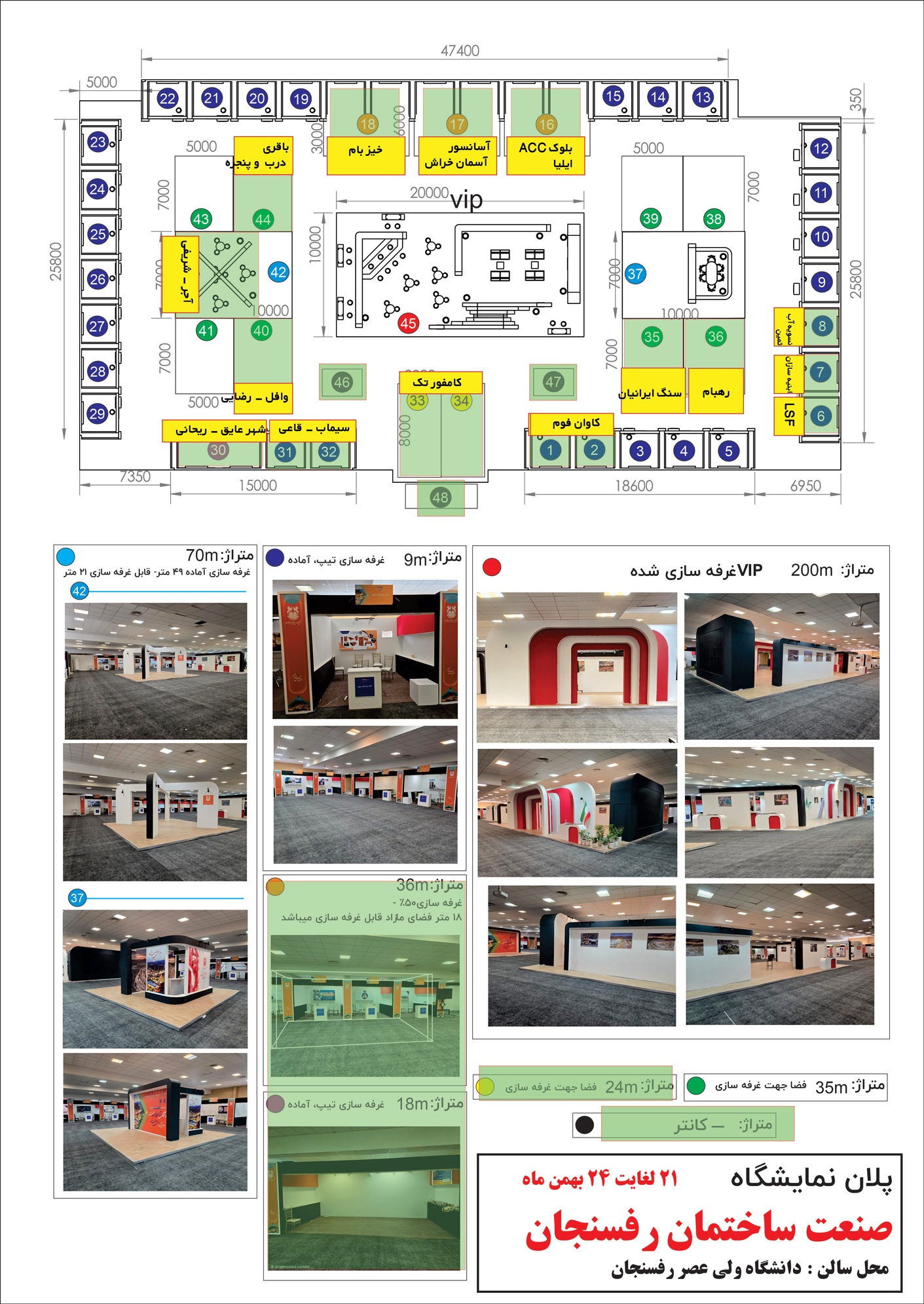 توجه شود پلان نمایشگاه به صورت تقریبی هست و امکان تغییر و رزرو غرفه ها در هر لحظه وجو دراد لطفا جهت هماهنگی و رزرو حتما تلفنی استعلام شود .